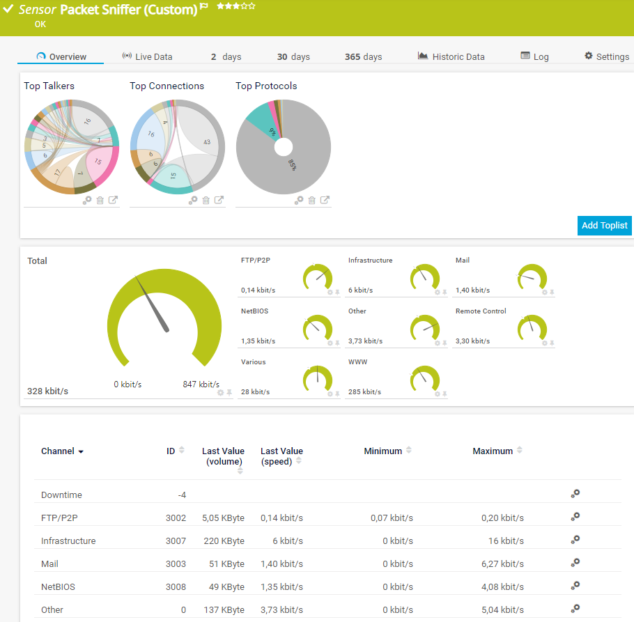 For all Flow (NetFlow, jFlow, sFlow, IPFIX) and Packet Sniffer sensors, Toplists are available on the sensor's Overview tab. Using Toplists, you can review traffic data for small time periods in great detail.