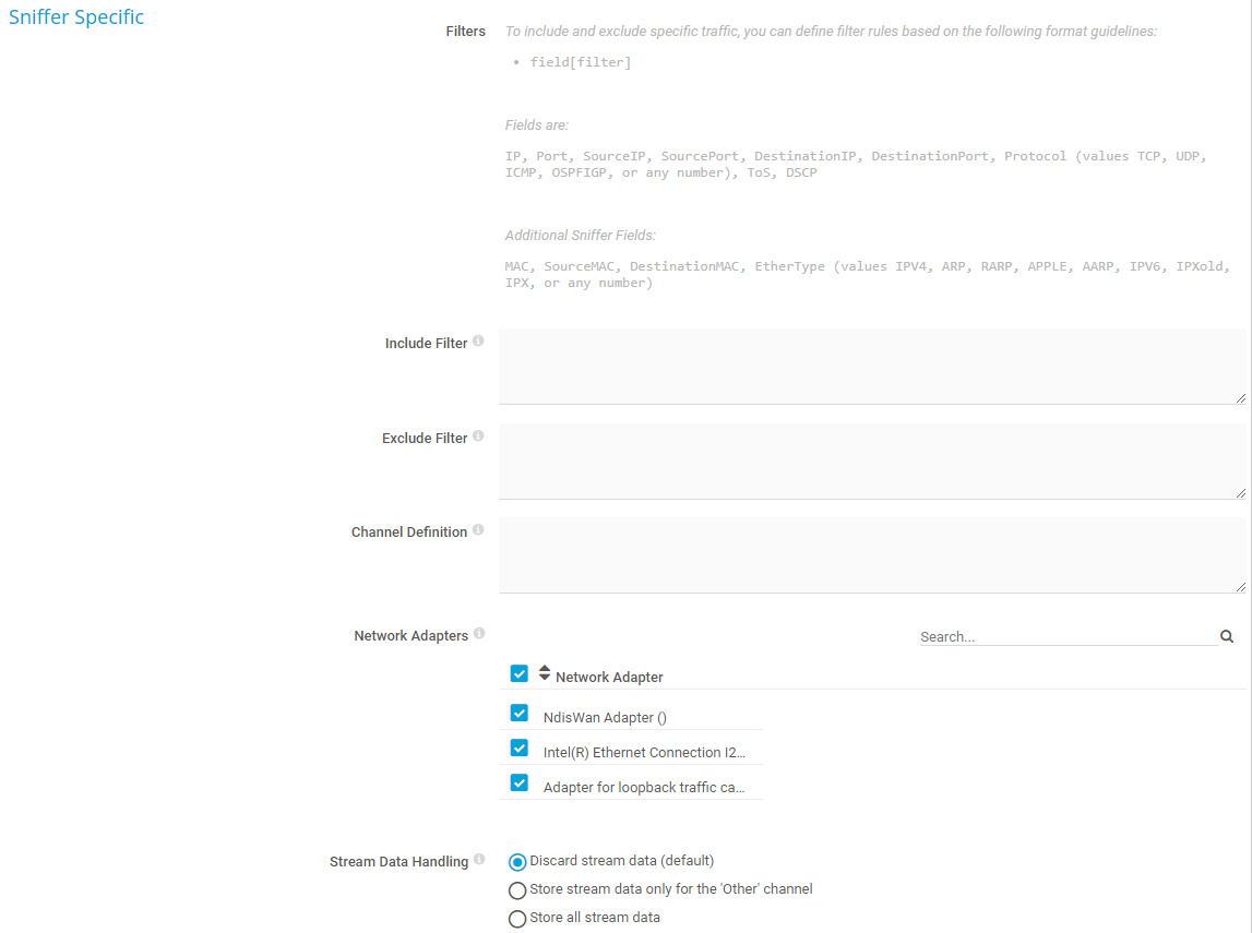The Packet Sniffer (Custom) sensor monitors the headers of data packets that pass a local network adapter using a built-in packet sniffer. With this sensor, you can define your own channel definitions to divide traffic into different channels.